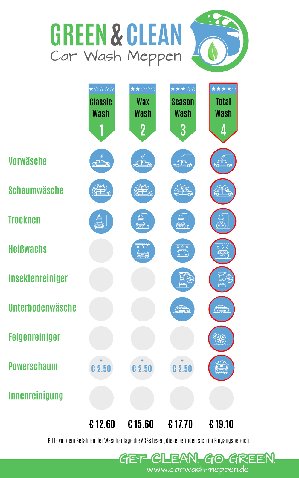 Bei Green & Clean finden Sie immer die richtige Wäsche für Ihr Auto. Ganz egal, ob Sie nur mal schnell waschen wollen oder Sie eine Pflegebehandlung vom Feinsten wünschen.